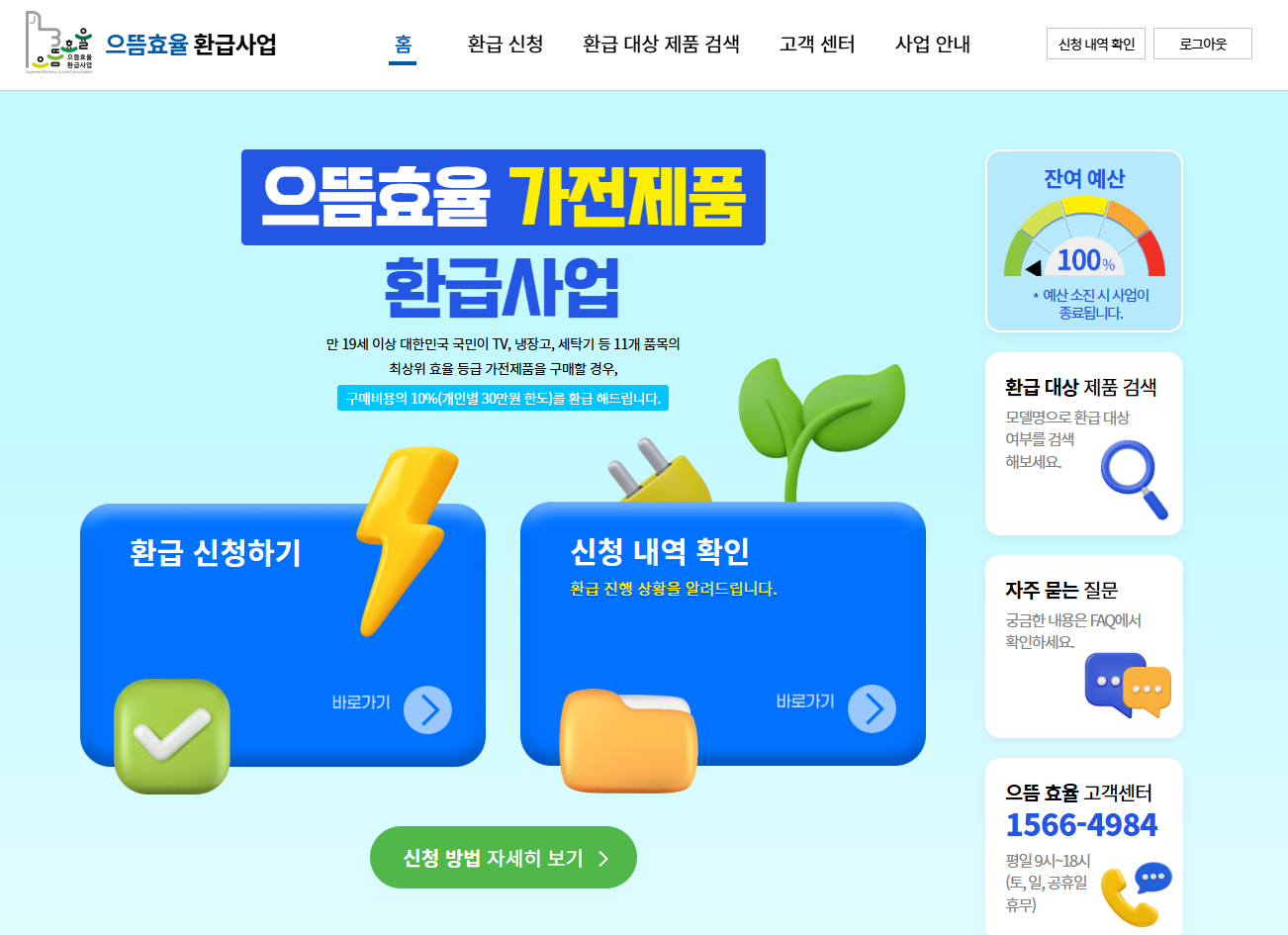 환급 신청은 한국에너지공단에서 운영하는 으뜸효율 가전제품 구매비용 환급사업 공식 홈페이지에서만 가능합니다.